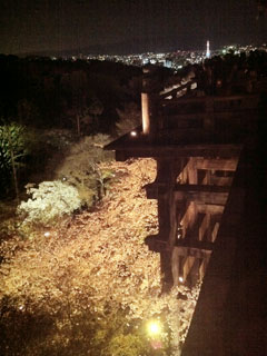 京都駅から市バス206系統に乗り、五条坂で下車。まずは清水寺へ。鮮やかな朱の建物と、ライトアップされた桜。