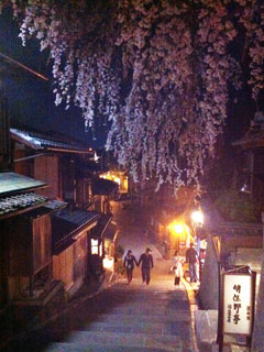 産寧坂を通って四条のほうへ。春の闇に紛れて出歩く人影がロマンチック。