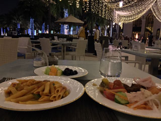 Taxi でThe Ritz-Carlton Abu Dhabi, Grand Canal に戻る。費用はDh12 (Taxi の最低料金)。少し館内を散歩してから、プールに面した屋外スペースでビュッフェスタイルの夕食をとる。Dh245。さすがリッツカールトン、ビュッフェでもかなりお高い。