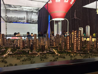政府系開発デベロッパーEMAAR社のレジデンス等販売ブース。Dubai Creek Harbour の模型。中央の青い塔が、2020年完成予定の世界で一番高いタワー(になる予定の) Dubai Creek Tower。設計はSantiago Calatrava。