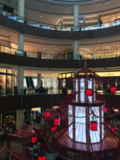 ロビーの5層吹抜空間を見上げる。金色の空間に、中国の春節を祝う赤いインスタレーション。ロビーで寛ぐ人たちも中国系の人が多い。中国の勢いを感じる。