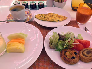 Sofitel Dubai Downtown 2日目の朝食ビュッフェ。Metro Station 至近の快適な都市型滞在に別れを告げて、今日はAbu Dhabi へ移動。2時間程度の乗車となる長距離バスにはトイレがないとのことなので、朝食は軽めにすませる。